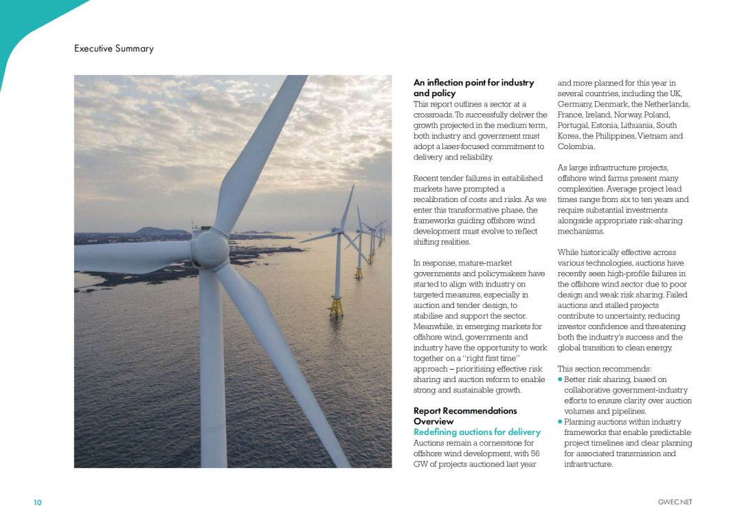 GWEC的市场信息团队预测,海上风电新增并网装机容量将从2024年的8GW增长到2030年的36GW。然而,由于美国的负面政策环境以及英国和丹麦的拍卖失败,GWEC的短期展望比去年的预测下调了24%。