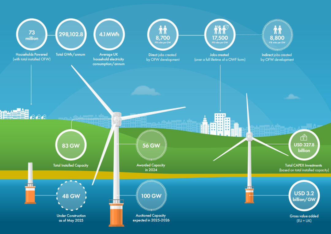 报告预测:海上风电行业未来十年(2025-2034年)的年均复合增长率为21%,这意味着将新增350GW的海上风能容量,到2034年底,全球海上风电总装机容量将达到441GW。