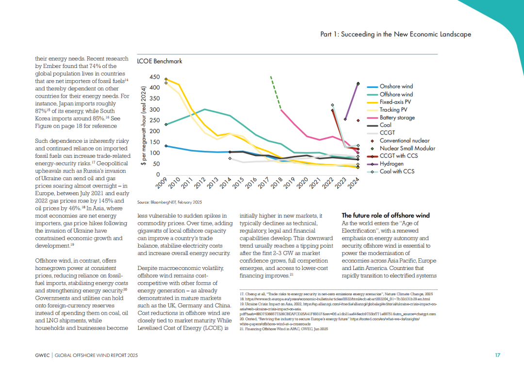 报告内容显示:“在过去十年中,全球海上风电市场平均每年增长10%,截至2024年底,海上风电累计并网装机达到83.2GW,占到全球风能总装机的7.3%。”