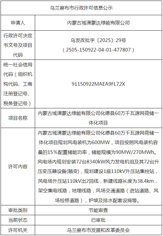 内蒙古域潇蒙达绿能有限公司化德县60万千瓦源网荷储一体化项目规划风电装机为600MW,项目按照风电装机容量的15%配置储能功率,储能规模为90MW/270MWh。风电场内规划安装72台8340kW风力发电机组及其72台升压变压器设备(箱变),规划建设1座110kV升压站集控站,风电场升压站110kV出2回线,新建线路长度为38.4km,架空集电线路,地埋线路,风场交通道路(进站道路、风场检修道路),护坡及排水配套设施等。