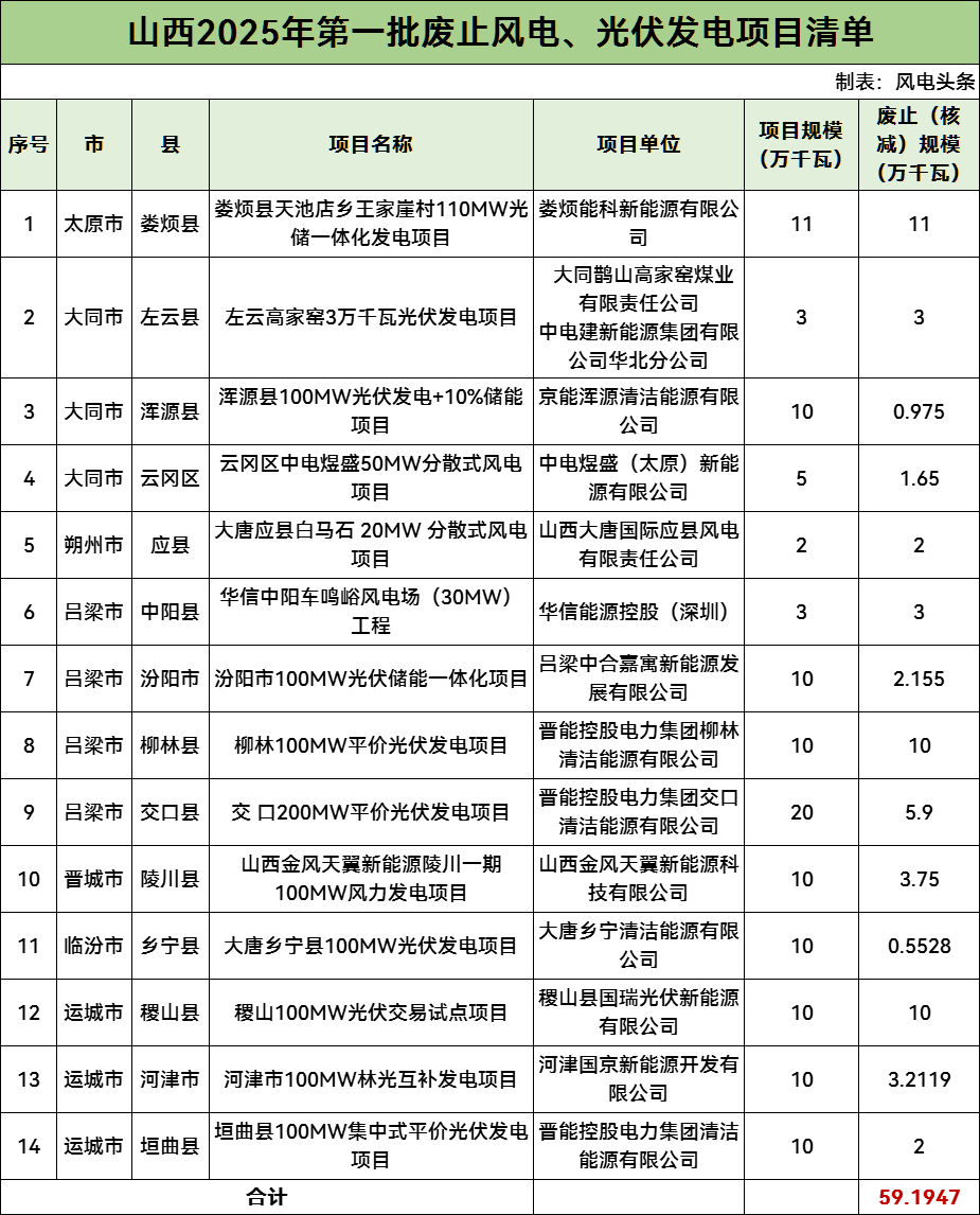 据悉,5月12日,山西省能源局公布2025年第一批废止风电光伏发电项目规模清单的通知。(详情查看:591.95MW!14个风电、光伏项目被废止!山西正式公布今年首批名单!)