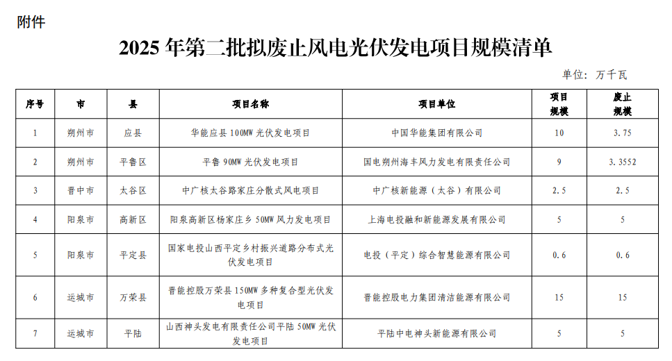 风电头条获悉,7月14日,山西省能源局发布关于公示2025年第二批拟废止风电光伏发电项目规模的清单。