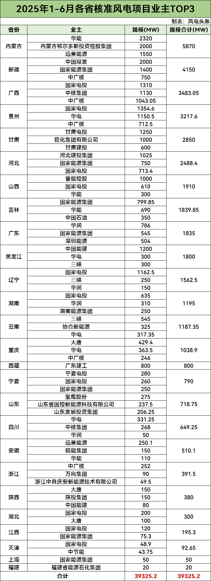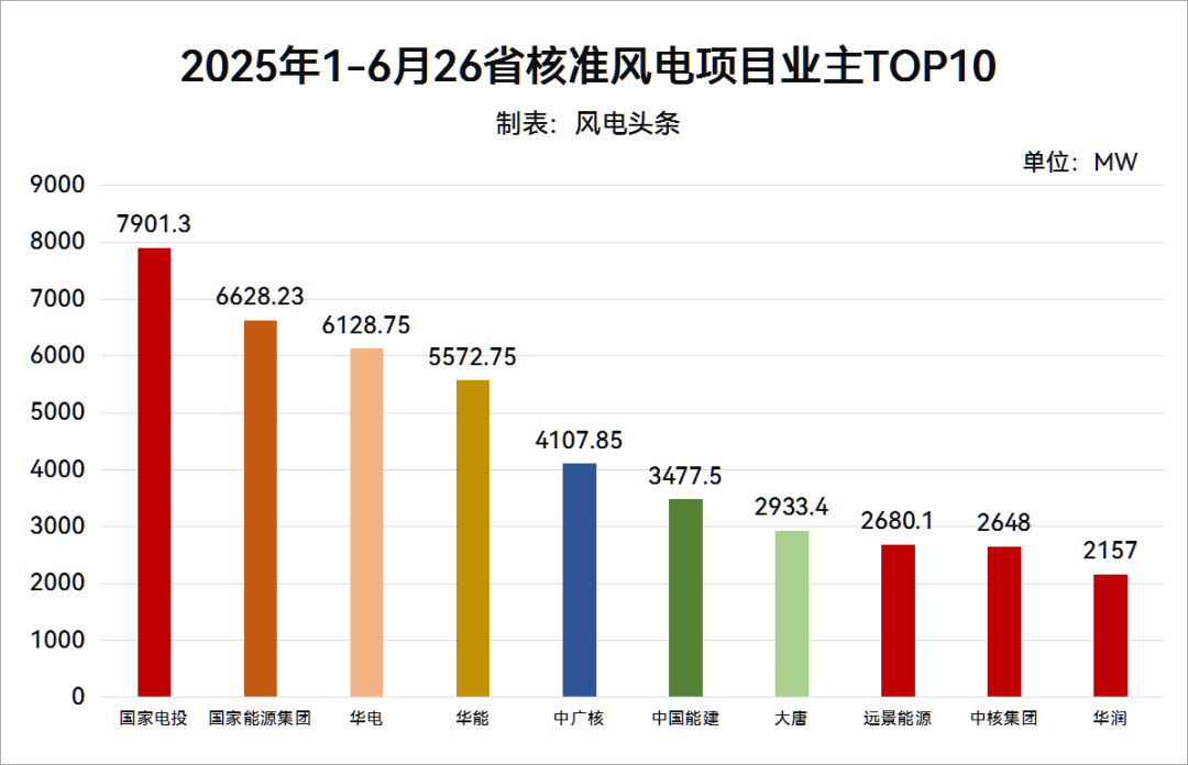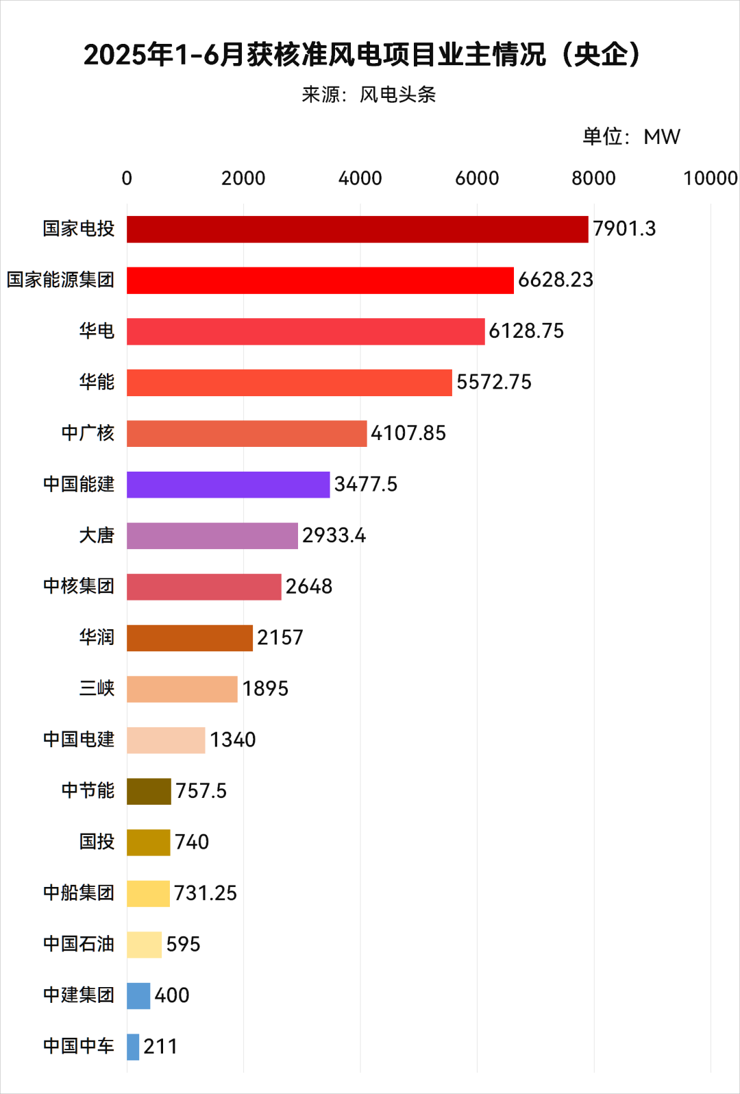 据风电头条根据公开信息统计,2025年1-6月核准的风电项目共78972.71MW(约79GW)明确项目投资企业,包括国家电投、国家能源集团、华电、华能、中广核、中国能建、大唐、中核集团、华润、三峡、中国电建、中节能、国投、中国绿发、甘肃电投、河北建投集团、晋能控股、中国石油、远景能源、运达股份等。