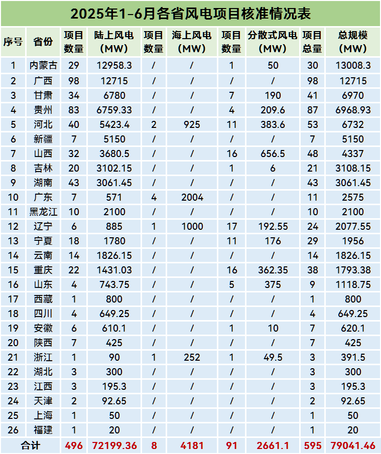 风电头条根据公开信息不完全统计,2025年1-6月核准批复的风电项目共计595个,规模总计79041.46MW(约79GW)。(注:贵州为2024年12月-2025年4月核准风电项目;新疆、西藏为备案项目)