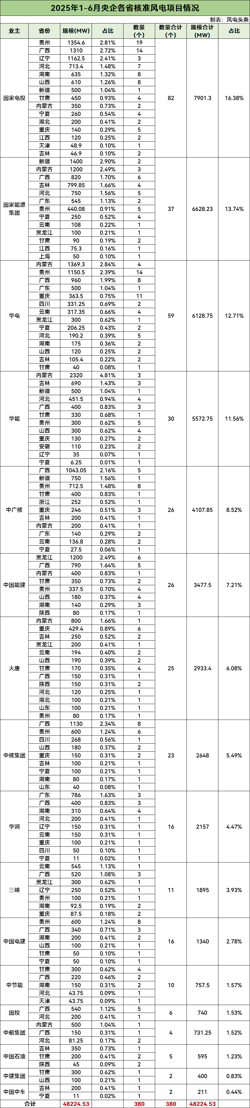 据风电头条梳理,2025年1-6月央企获核准风电项目共380个,规模合计48224.53MW(约48.22GW)。