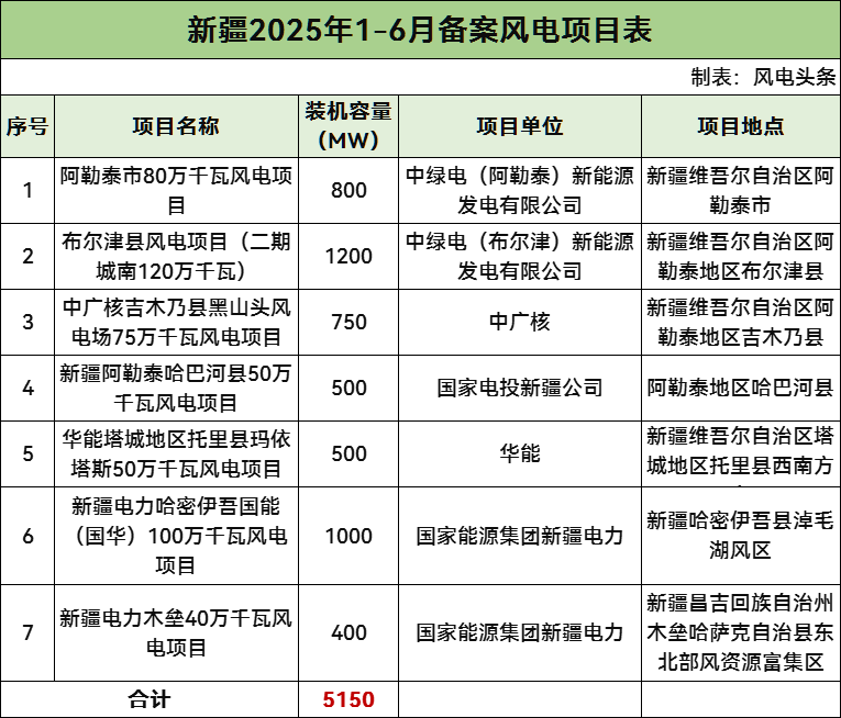 新疆备案7个风电项目,总规模5150MW,均为陆上风电项目。