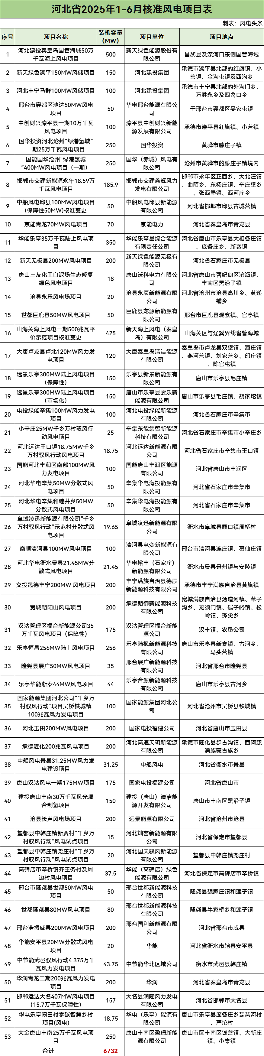 河北核准53个风电项目,总规模6732MW,其中,40个为陆上风电项目,规模总计5423.4MW;2个为海上风电项目,规模总计925MW;11个为分散式风电项目,规模总计383.6MW。