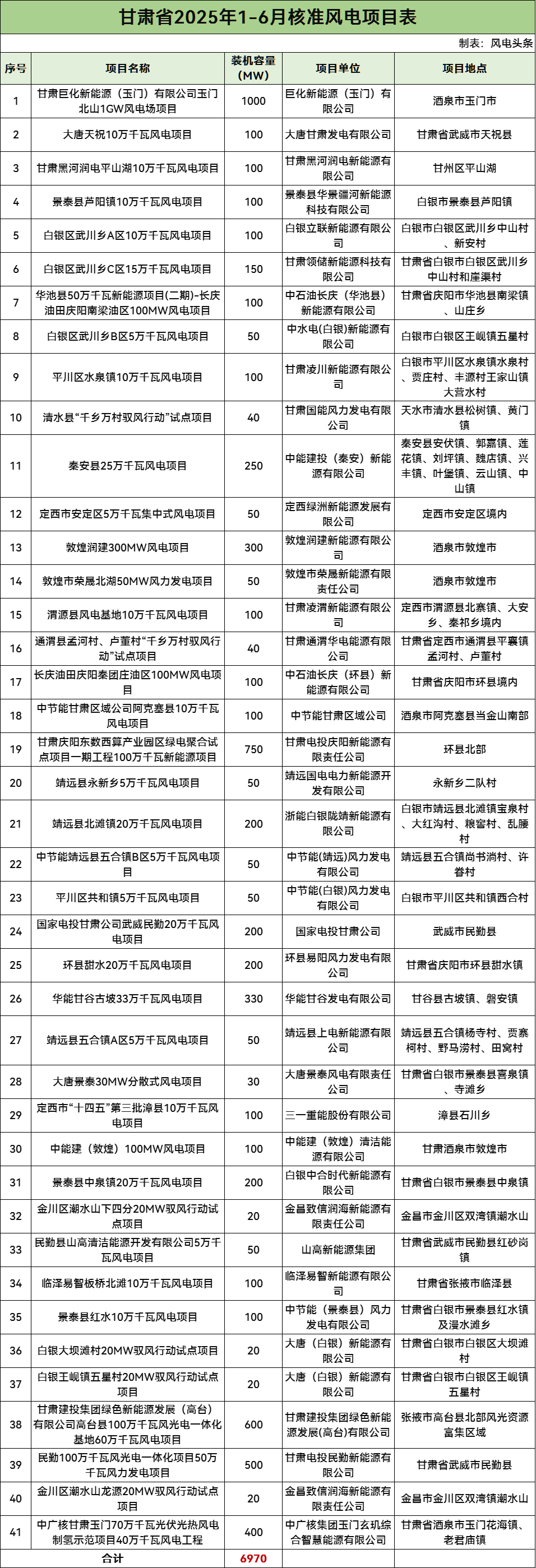 甘肃核准41个风电项目,总规模6970MW,其中,34个为陆上风电项目,规模总计6780MW;7个为分散式风电项目,规模总计190MW。