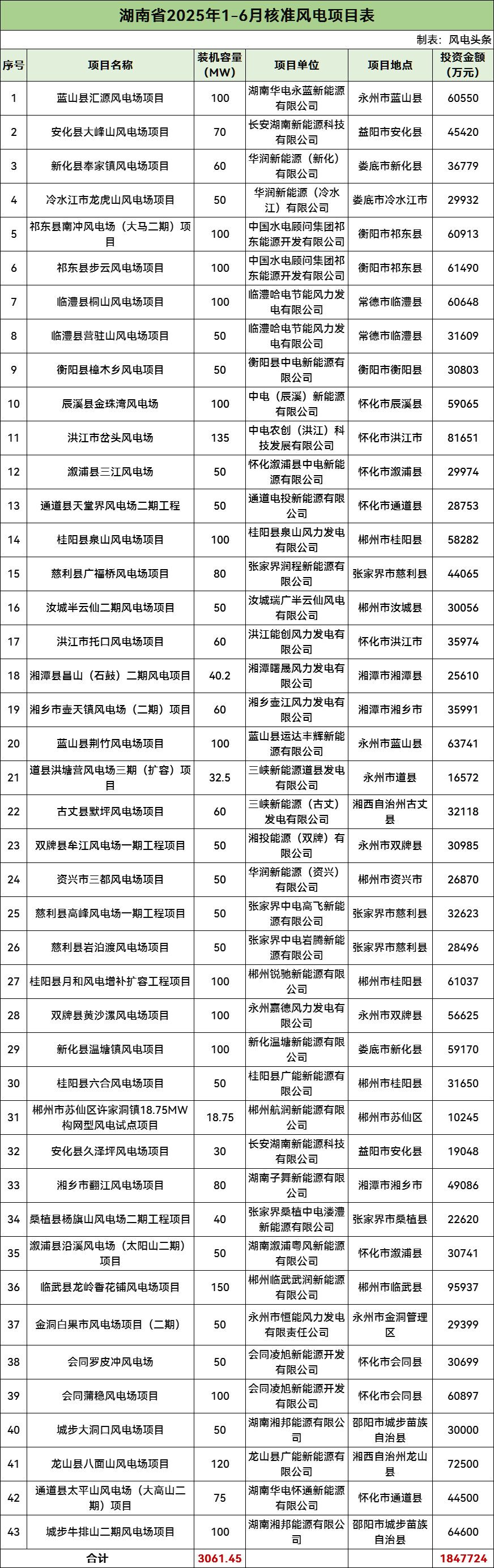 湖南核准43个风电项目,总规模3061.45MW,总投资1847724万元,均为陆上风电项目。
