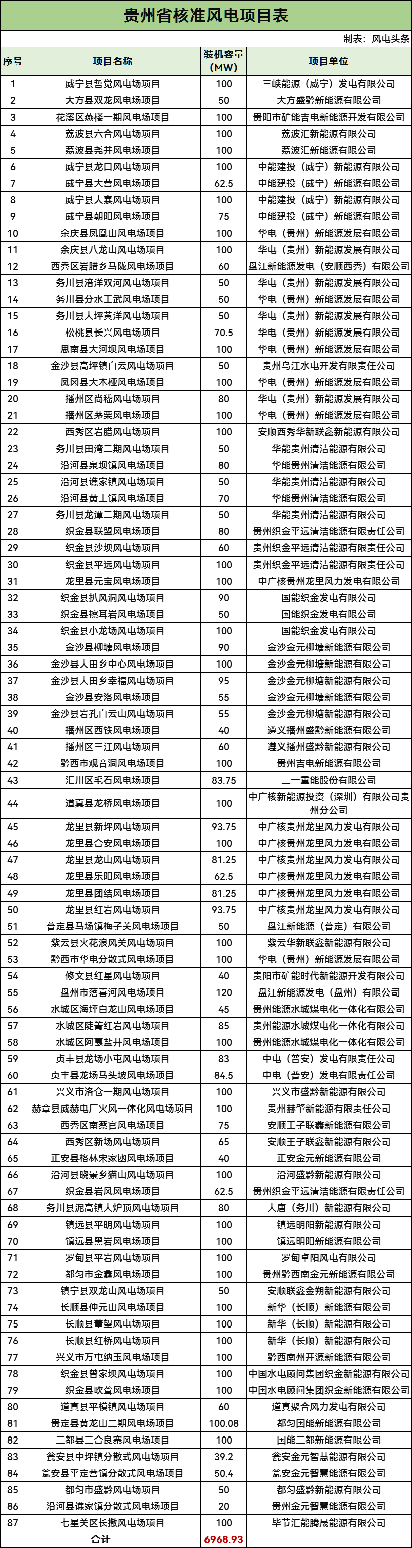 贵州核准87个风电项目,总规模6968.93MW,其中83个为陆上风电项目,规模总计6759.33MW;4个为分散式风电项目,规模总计209.6MW。