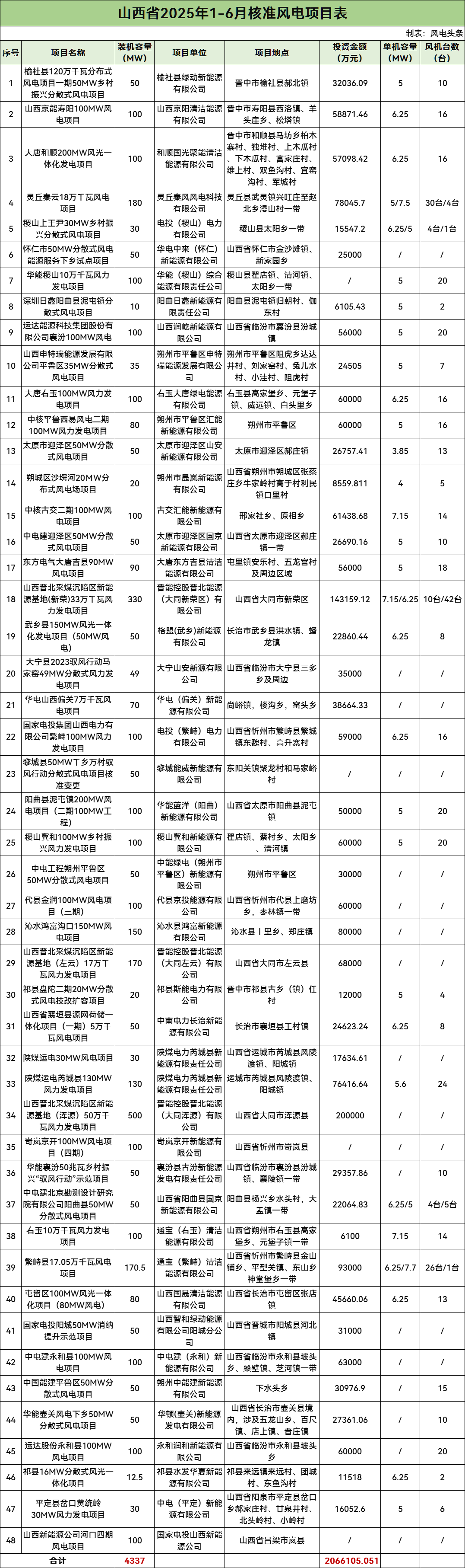 山西核准48个风电项目,总规模4337MW,总投资206.61亿元,其中,32个为陆上风电项目,规模总计3680.5MW;16个为分散式风电项目,规模总计656.5MW。