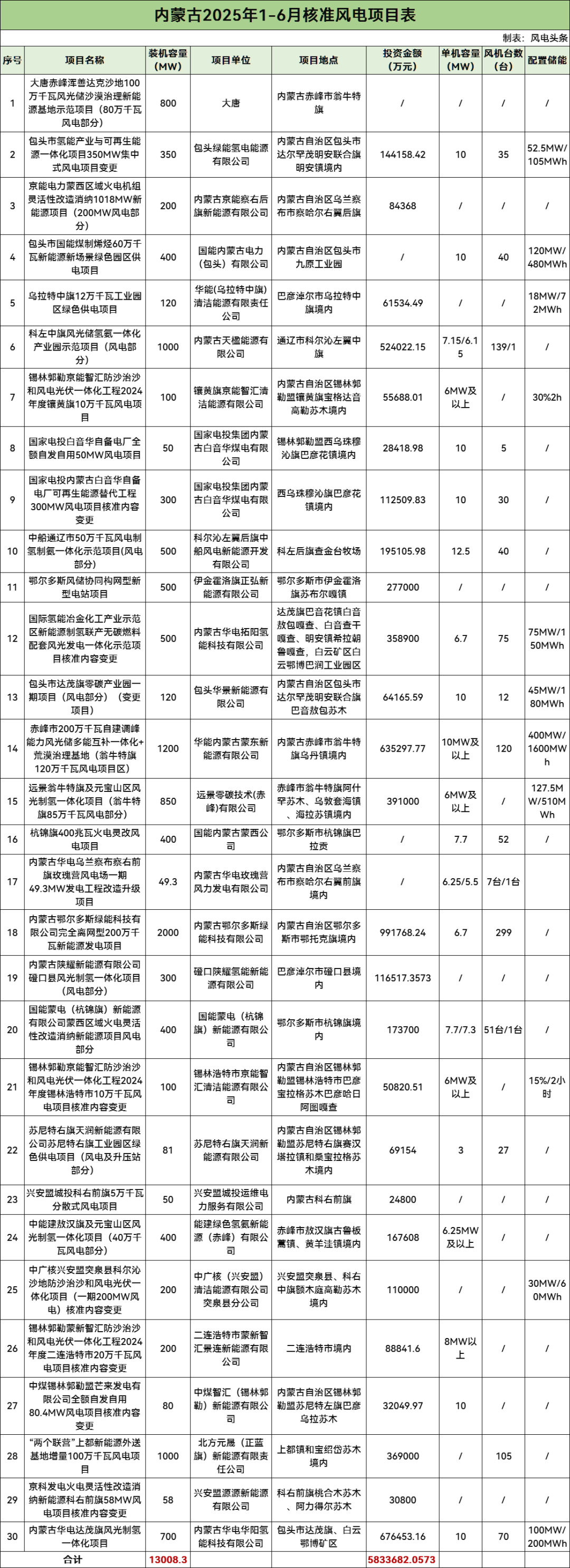 内蒙古核准30个风电项目,总规模13008.3MW,总投资583.37亿元。其中,29个为陆上风电项目,规模总计12958.3MW;1个为分散式风电项目,规模总计50MW。