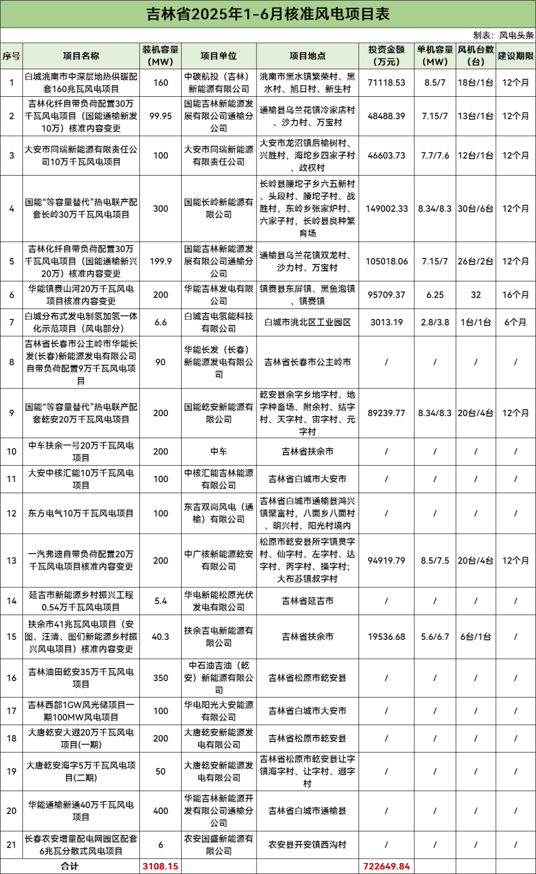 吉林核准21个风电项目,总规模3108.15MW,总投资722649.84万元。其中,20个为陆上风电项目,规模总计3102.15MW;1个为分散式风电项目,规模总计6MW。