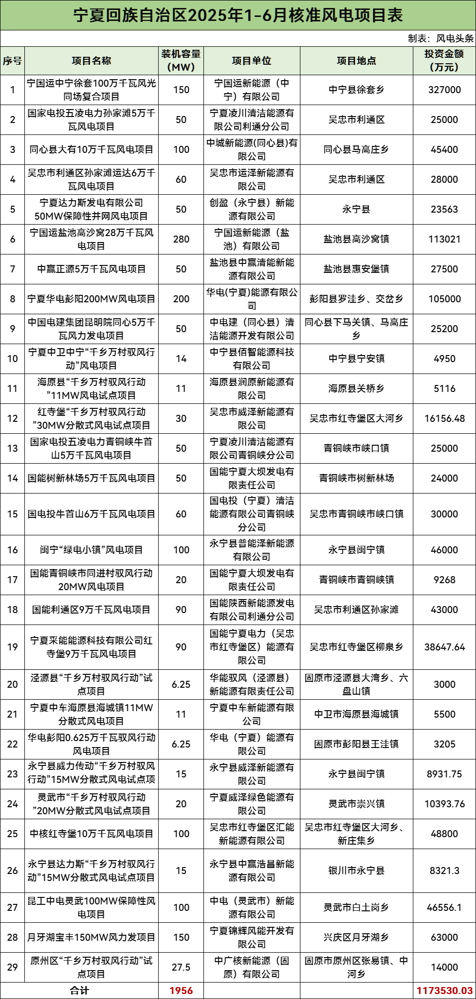 宁夏核准29个风电项目,总规模1956MW,总投资1173530.03万元。其中,18个为陆上风电项目,规模总计1780MW;11个为分散式风电项目,规模总计176MW。