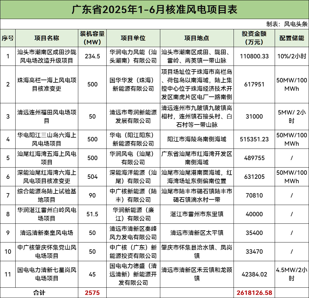 广东核准11个风电项目,总规模2575MW,总投资2618126.58万元,其中,7个为陆上风电项目,规模总计571MW;4个为海上风电项目,规模总计2004MW。