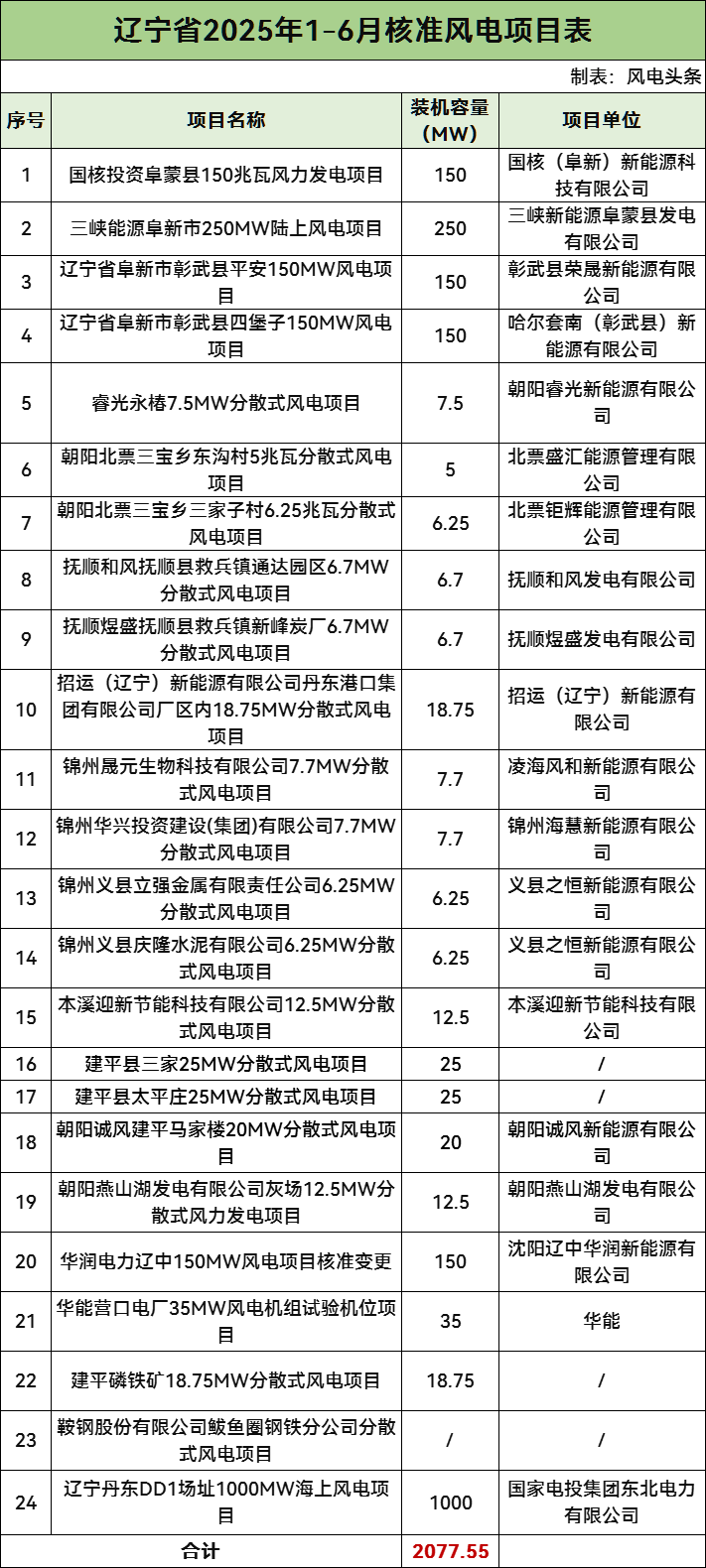 辽宁核准24个风电项目,总规模2077.55MW,其中,6个为陆上风电项目,规模总计885MW;1个为海上风电项目,规模总计1000MW;17个为分散式风电项目,规模总计192.55MW。