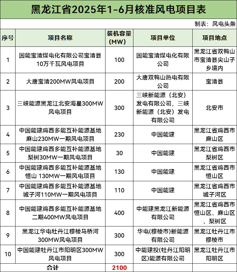黑龙江核准10个风电项目,总规模2100MW,均为陆上风电项目。