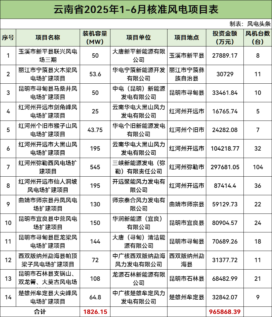 云南核准14个风电项目,总规模1826.15MW,总投资965868.39万元,均为陆上风电项目。