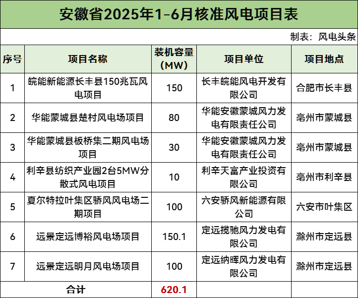 安徽核准7个风电项目,总规模620.1MW,其中,6个为陆上风电项目,规模总计610.1MW;1个为分散式风电项目,规模总计10MW。