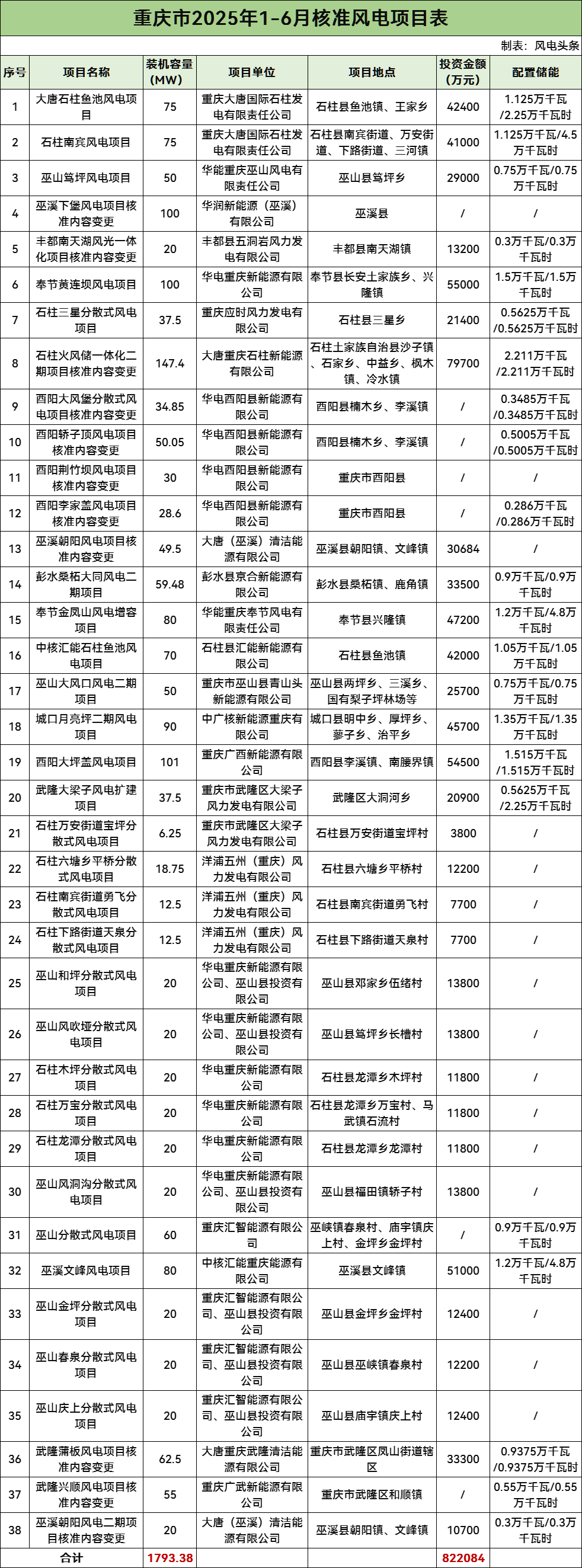 重庆核准38个风电项目,总规模1793.38MW,总投资822084万元。其中,22个为陆上风电项目,规模总计1431.03MW;16个为分散式风电项目,规模总计362.35MW。