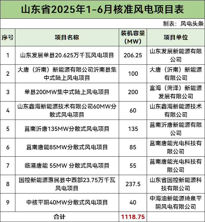 山东核准9个风电项目,总规模1118.75MW,其中,4个为陆上风电项目,规模总计743.75MW;5个为分散式风电项目,规模总计375MW。