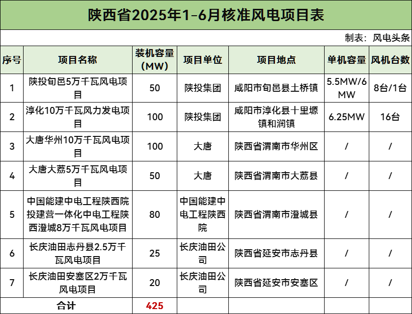 陕西核准7个风电项目,总规模425MW,均为陆上风电项目。