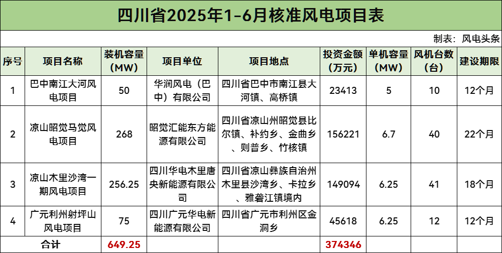 四川核准4个风电项目,总规模649.25MW,总投资374346万元,均为陆上风电项目。