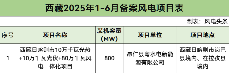 西藏备案1个风电项目,规模800MW,为风光热一体化项目。