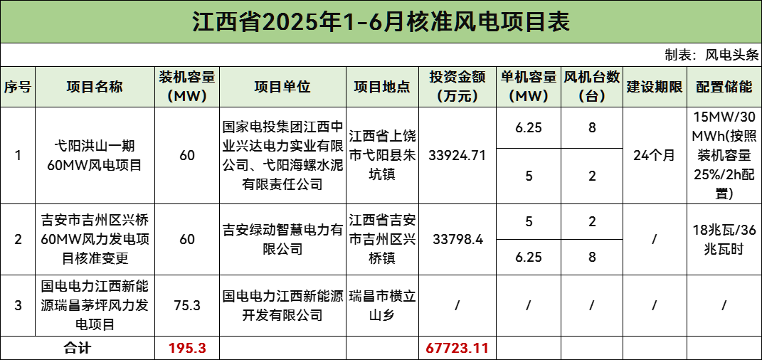 江西核准3个风电项目,总规模195.3MW,总投资67723.11万元,均为陆上风电项目。