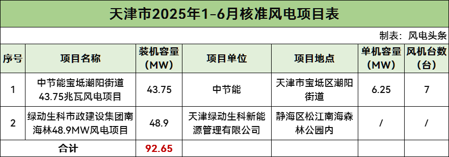 天津核准2个风电项目,总规模92.65MW,均为陆上风电项目。