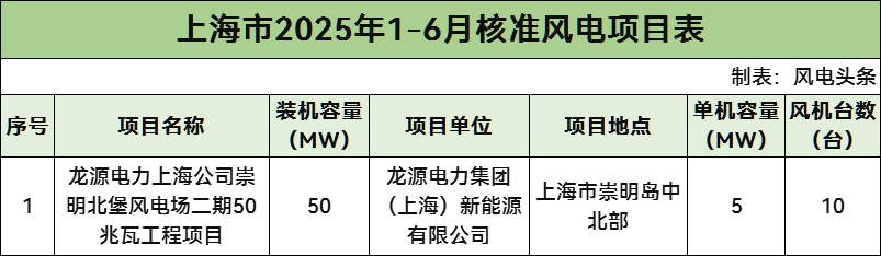 上海核准1个风电项目,总规模50MW,为陆上风电项目。