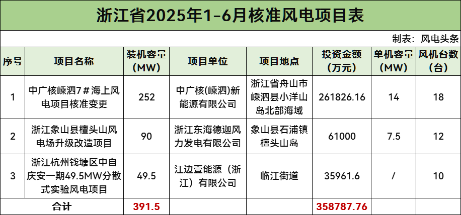 浙江核准3个风电项目,总规模391.5MW,总投资358787.76万元。其中,1个为陆上风电项目,规模总计90MW;1个为海上风电项目,规模总计252MW;1个为分散式风电项目,规模总计49.5MW。