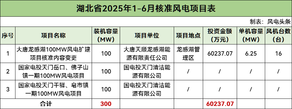 湖北核准3个风电项目,总规模300MW,总投资60237.07万元,均为陆上风电项目。