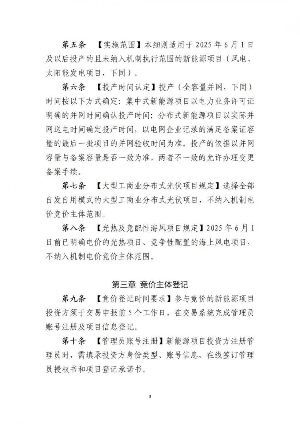 选择全部自发自用模式的大型工商业分布式光伏项目,不纳入机制电价竞价主体范围;2025年6月1日前已明确电价的光热项目、竞争性配置的海上风电项目,也不纳入机制电价竞价主体范围。