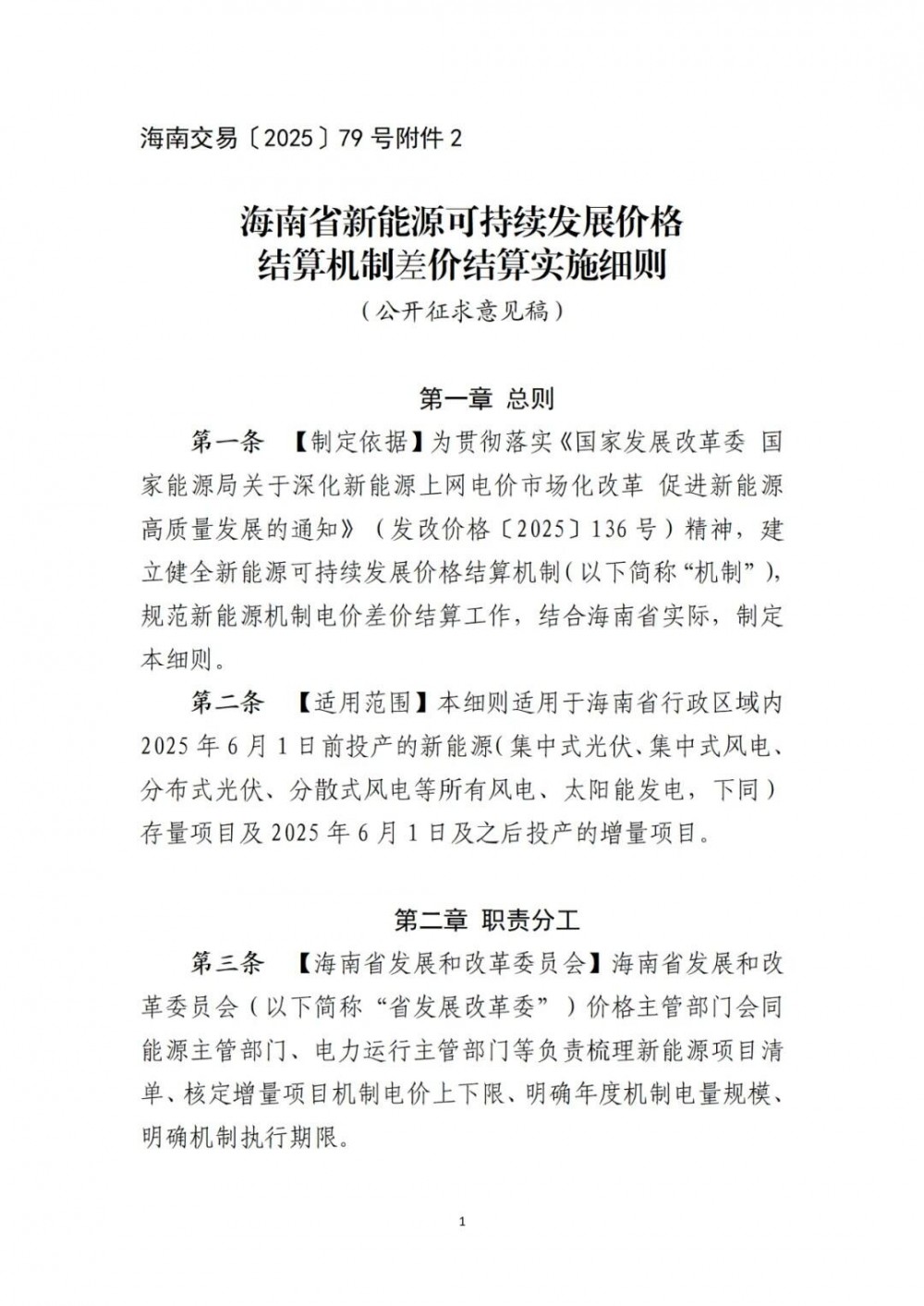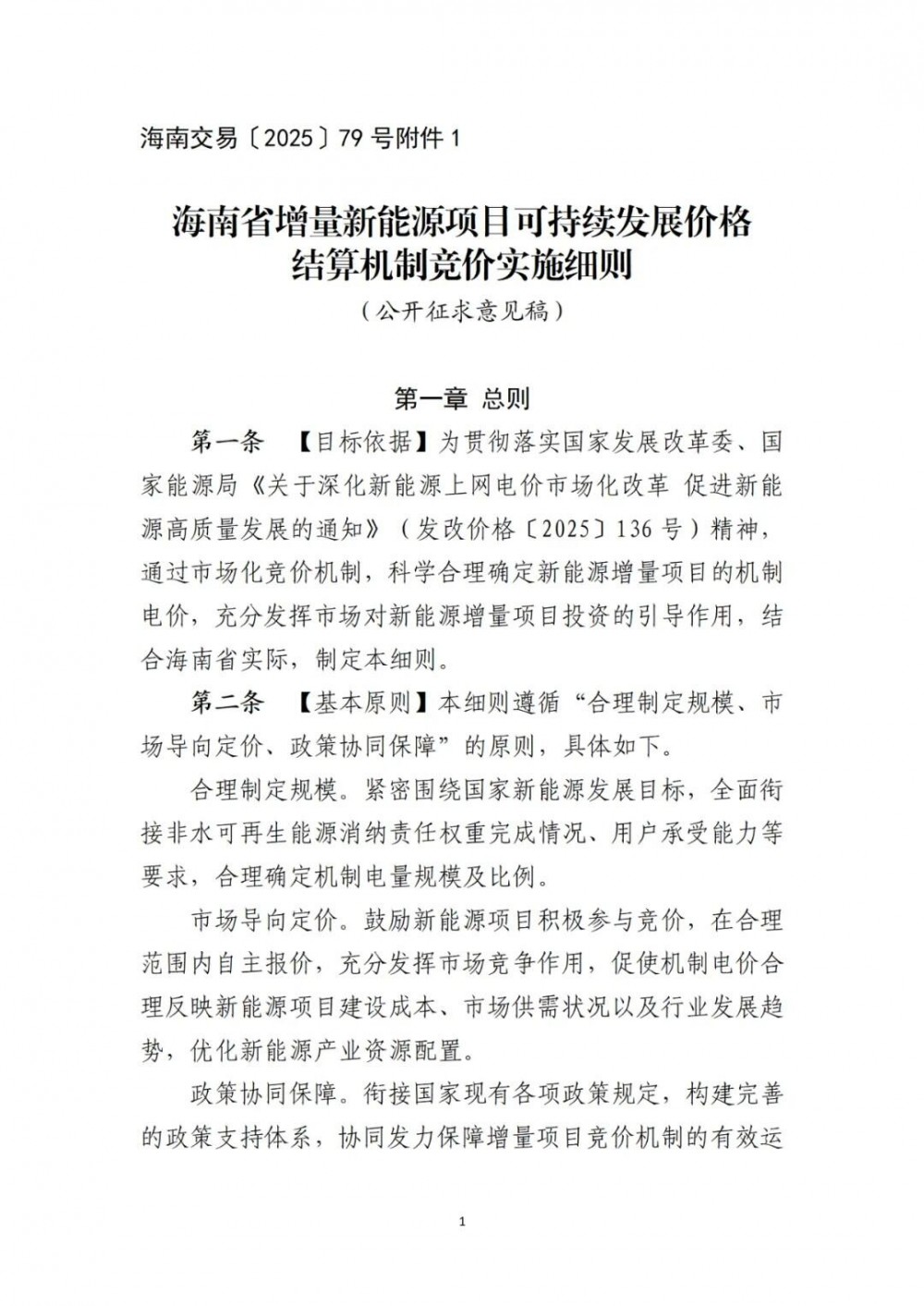 《海南省增量新能源项目可持续发展价格结算机制竞价实施细则》(公开征求意见稿)中指出,细则适用于2025年6月1日及以后投产的且未纳入机制执行范围的新能源项目(风电、太阳能发电项目)。