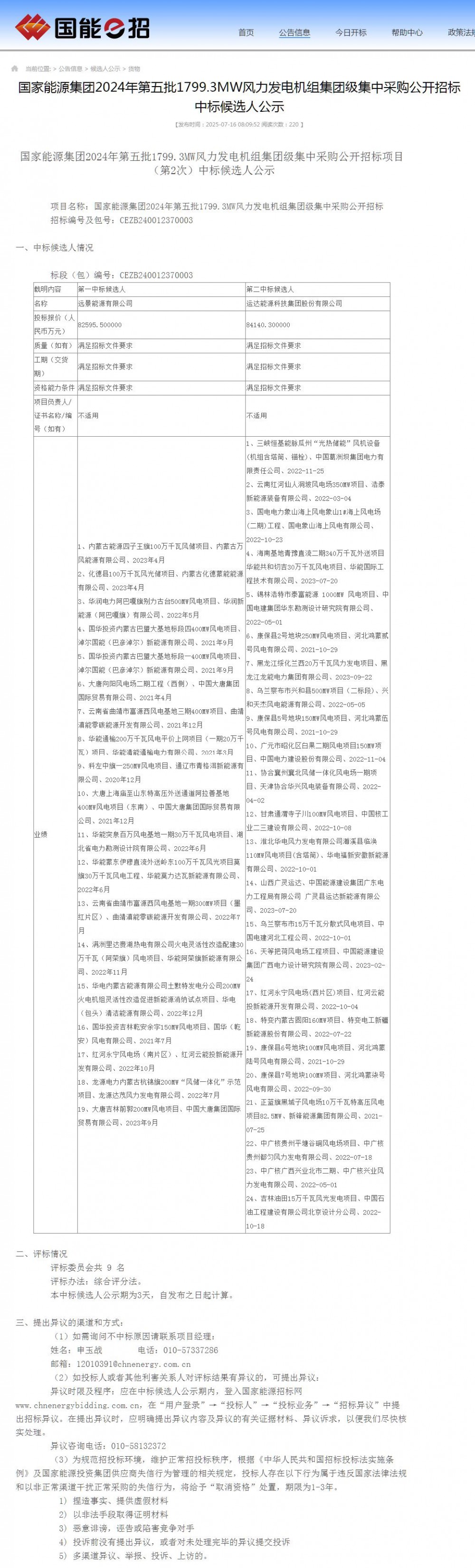 7月16日,国家能源集团2024年第五批1799.3MW风力发电机组集团级集中采购(第2次)标包三、国家能源集团2024年第四批1800MW风力发电机组集团级集中采购(第2次)标包四中标候选人公示。