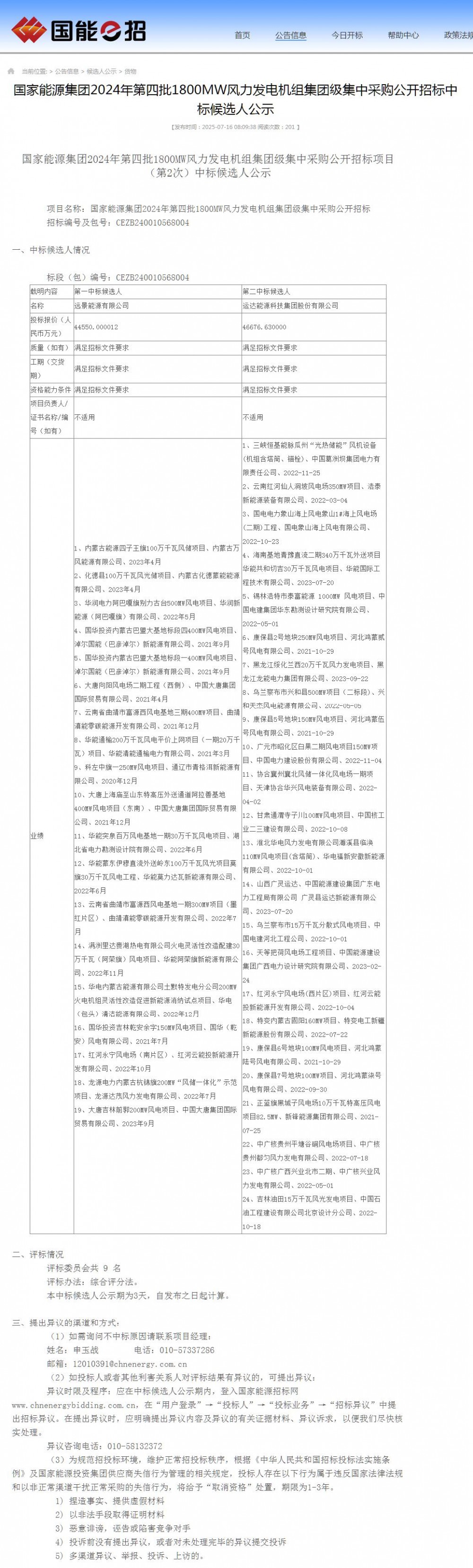 根据公示,远景能源作为第一中标候选人预中标。