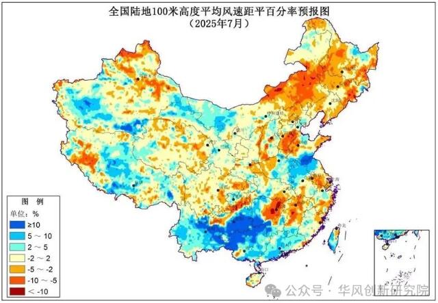 2025年7月全国陆地100米高度平均风速距平百分率预报图