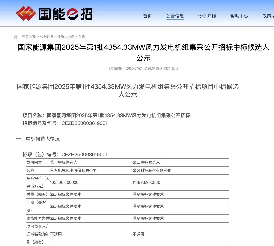 风电头条获悉,7月21日,国能e招发布2025年第1批4354.33MW风力发电机组集采公开招标项目中标候选人公示结果。此次公示结果为标包一包含的4个项目,合计规模585.4MW。