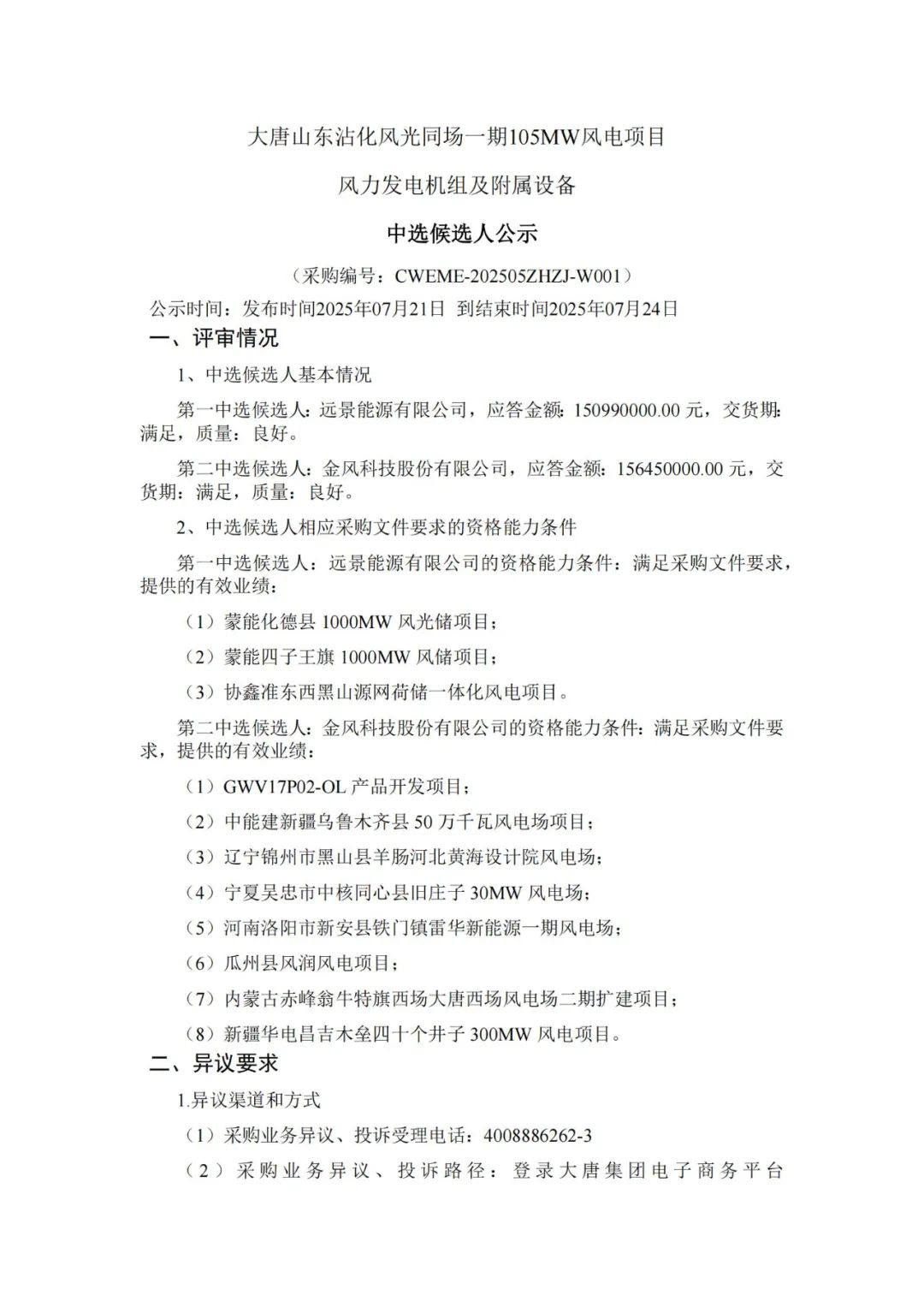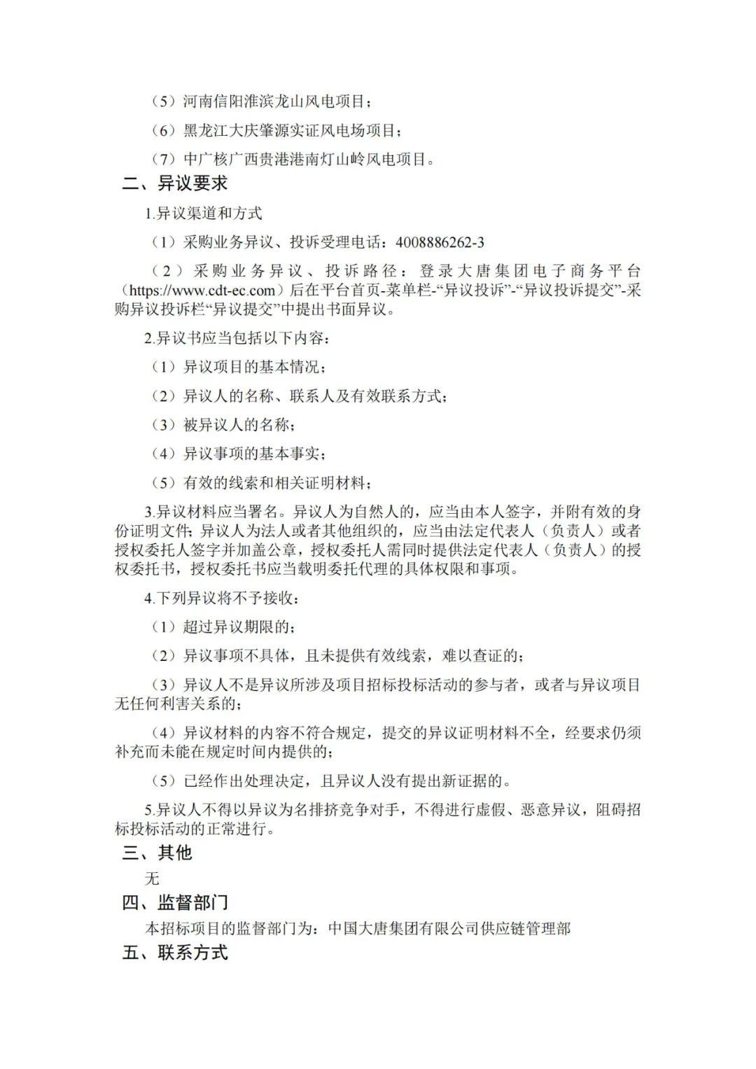 大唐山东沾化风光同场一期105MW风电项目位于山东省滨州市沾化区,采购容量105MW,不允许上下浮动,7.0MW≤单机容量≤8.0MW,叶轮直径≥220米,160米≤轮毂高度≤166米(风机叶片最高点海拔不超过280米);风机总台数14台;不接受混排,不接受降容;限定钢混塔。交货日期:2025年12月—2026年6月。
