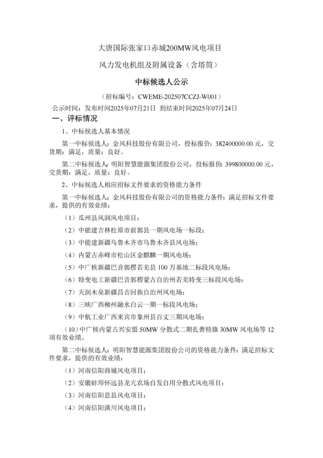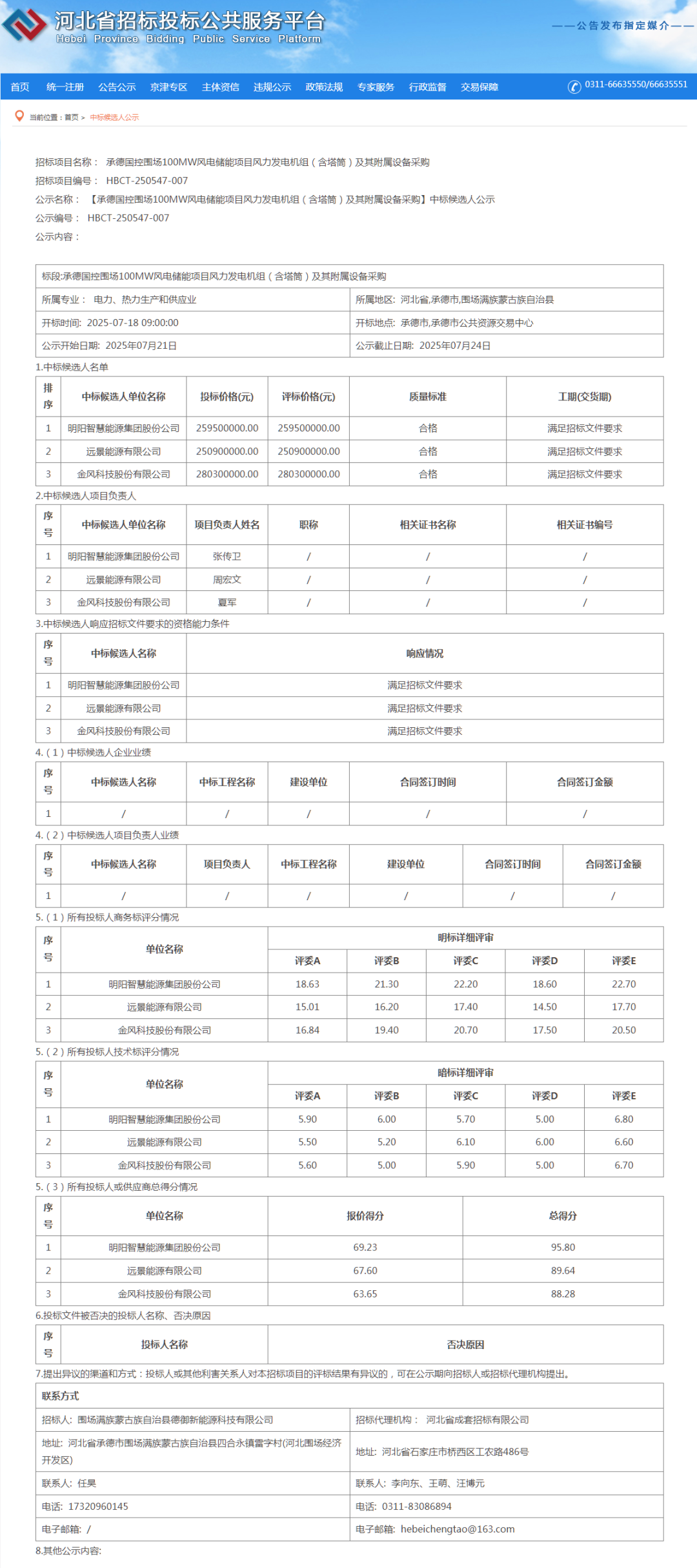 根据公示,金风科技、远景能源、明阳智能作为第一中标候选人预中标。