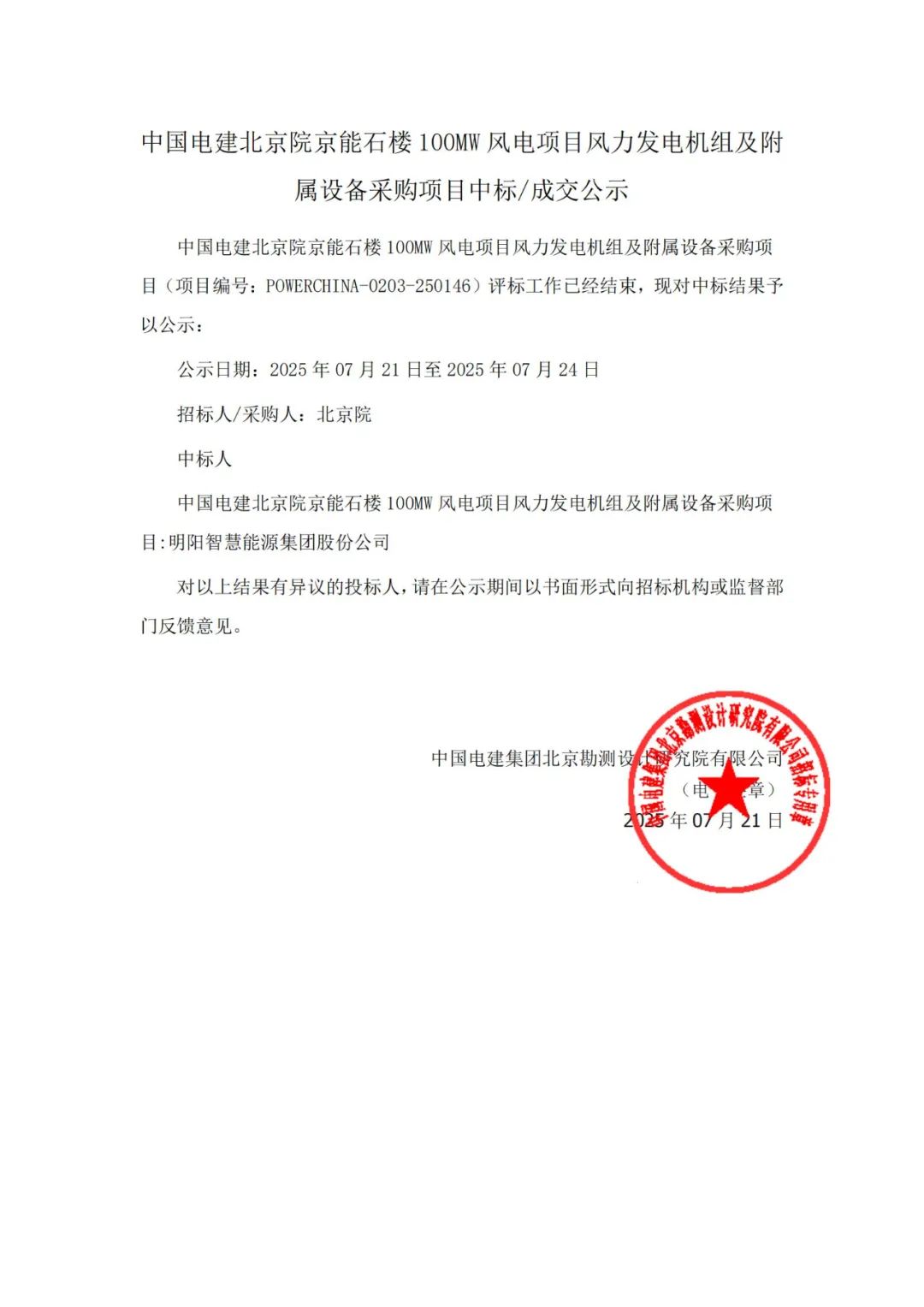 承德国控围场100MW风电储能项目位于河北省承德市围场满族蒙古族自治县下伙房乡,装机容量为100MW,本次采购项目所需的16台单机容量6.25MW的成套的风力发电机组(含塔筒)及其附属设备和伴随服务。交货期:锚栓组件计划供货时间为2025年7月30日前第一批6套锚栓组件到货;2025年8月30日前剩余全部锚栓组件到货;风力发电机组(含塔筒)计划供货时间为2025年8月30日前第一批6套风力发电机组(含塔筒)到货;2025年9月30日前剩余全部风力发电机组(含塔筒)到货。
