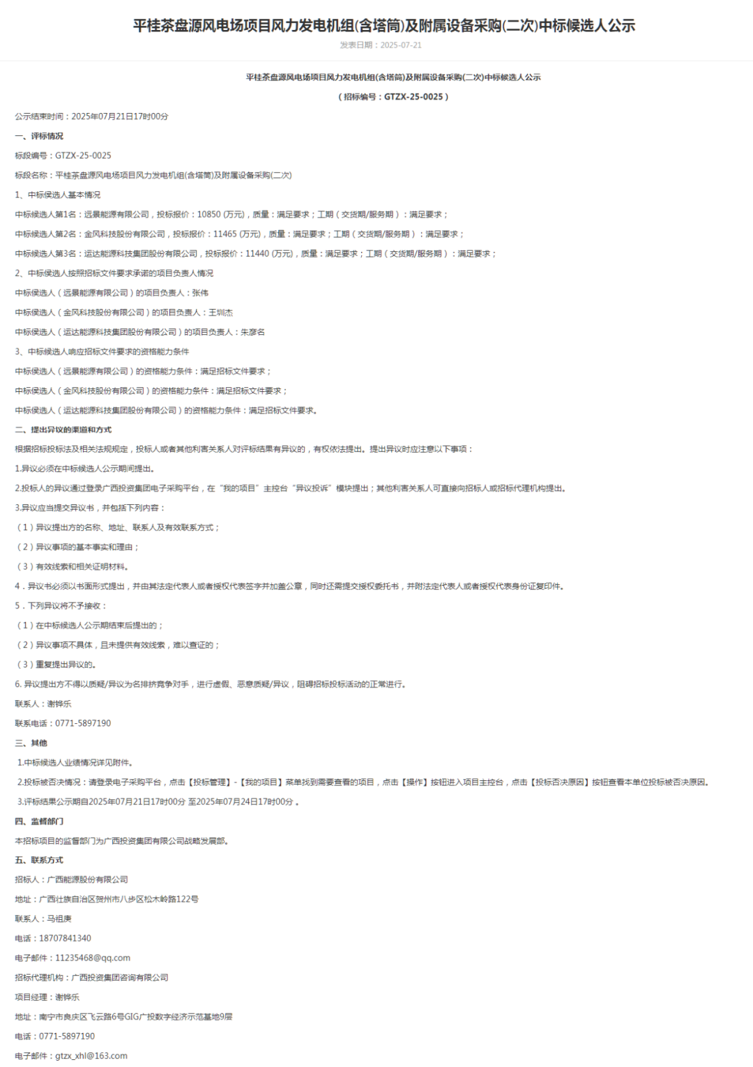 平桂茶盘源风电场项目位于广西贺州市平桂区,本项目招标采购范围为总装机容量50MW、单机容量6.25MW风力发电机组8台套(含塔筒及相关附件、锚栓组件及附件),交货期:2025年7月30日前完成2套锚栓组件到货,2025年9月30日前完成剩余锚栓组件到货;2025年9月30日前完成2套风机、塔筒及其它附属设备的到货,2025年10月30日前,完成剩余风机、塔筒及其它附属设备的到货。