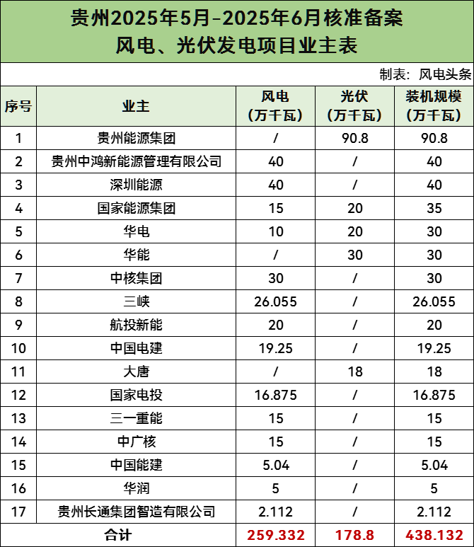 贵州省能源局2025年5月-2025年6月核准备案风电光伏发电项目情况