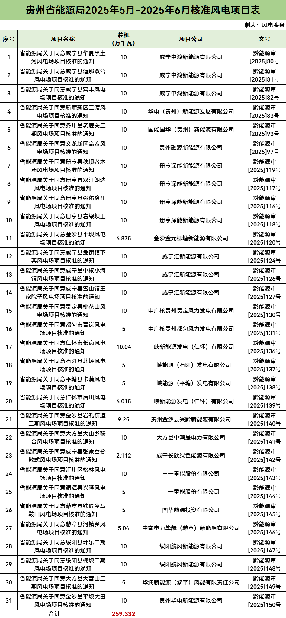 贵州2025年5月-2025年6月核准风电项目表如下:
