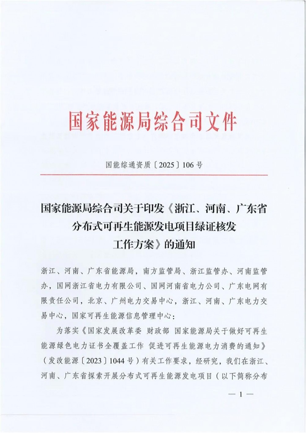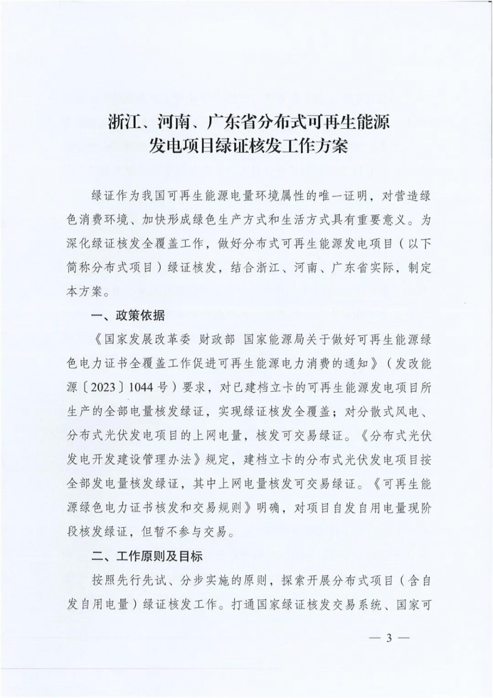 日前,国家能源局综合司印发《浙江、河南、广东省分布式可再生能源发电项目绿证核发工作方案》的通知。文件表示,在浙江、河南、广东省探索开展分布式可再生能源发电项目(含自发自用电量)绿证核发全覆盖工作。