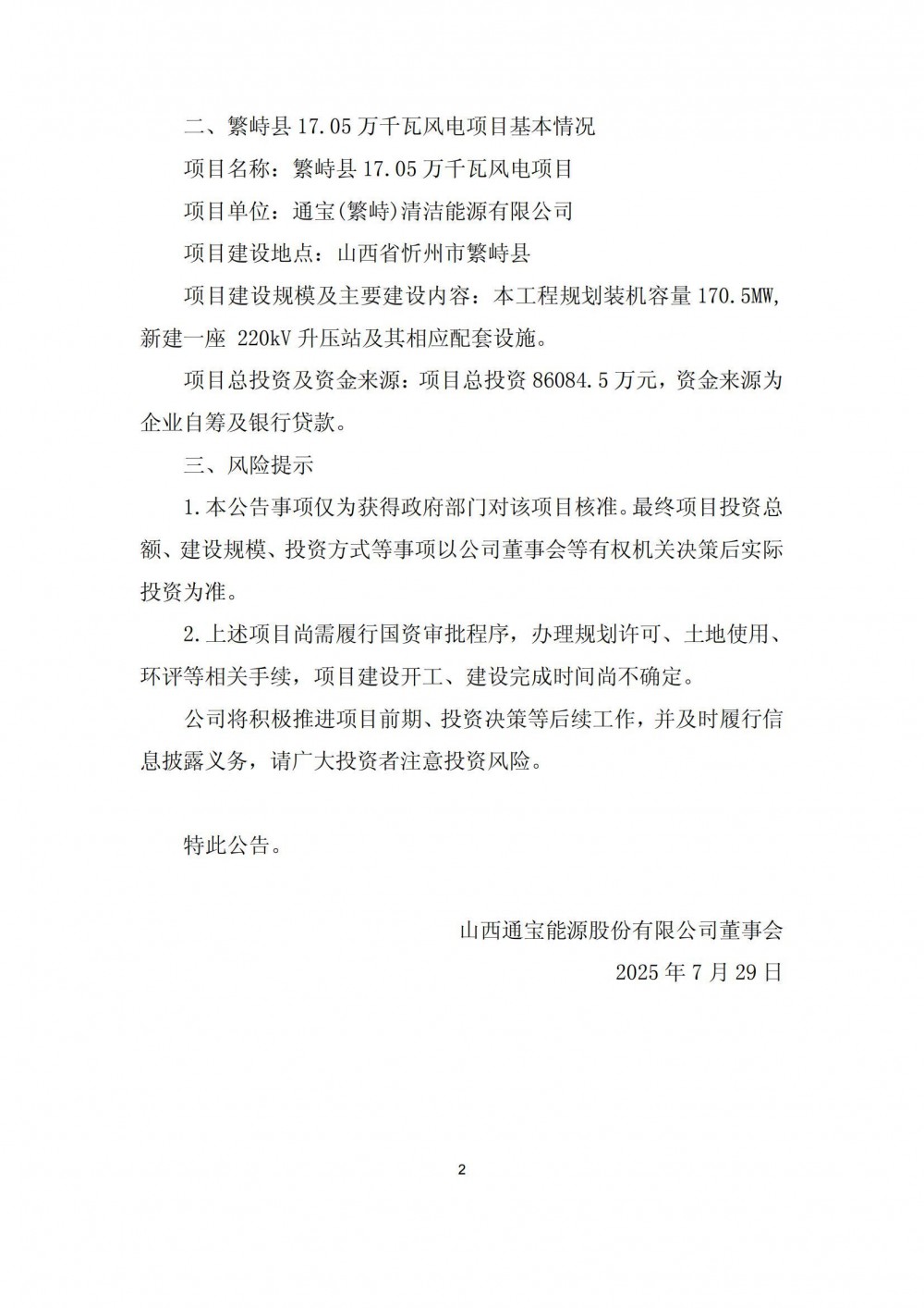 7月29日,山西通宝能源股份有限公司发布关于投资建设风电项目核准的公告。