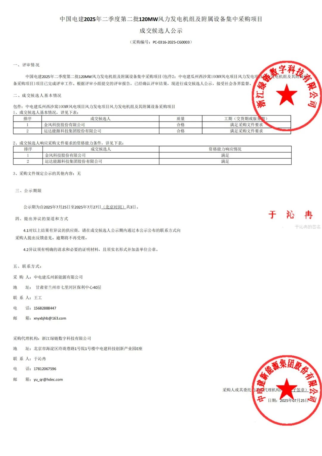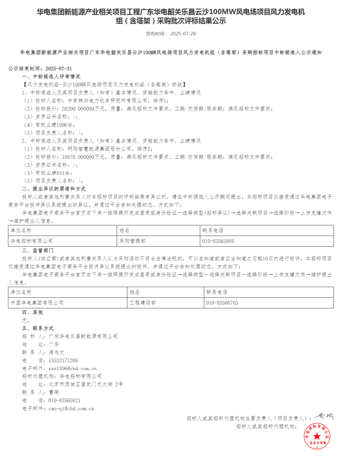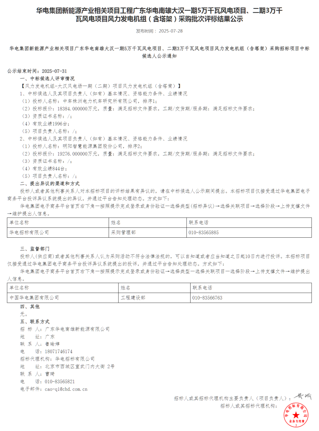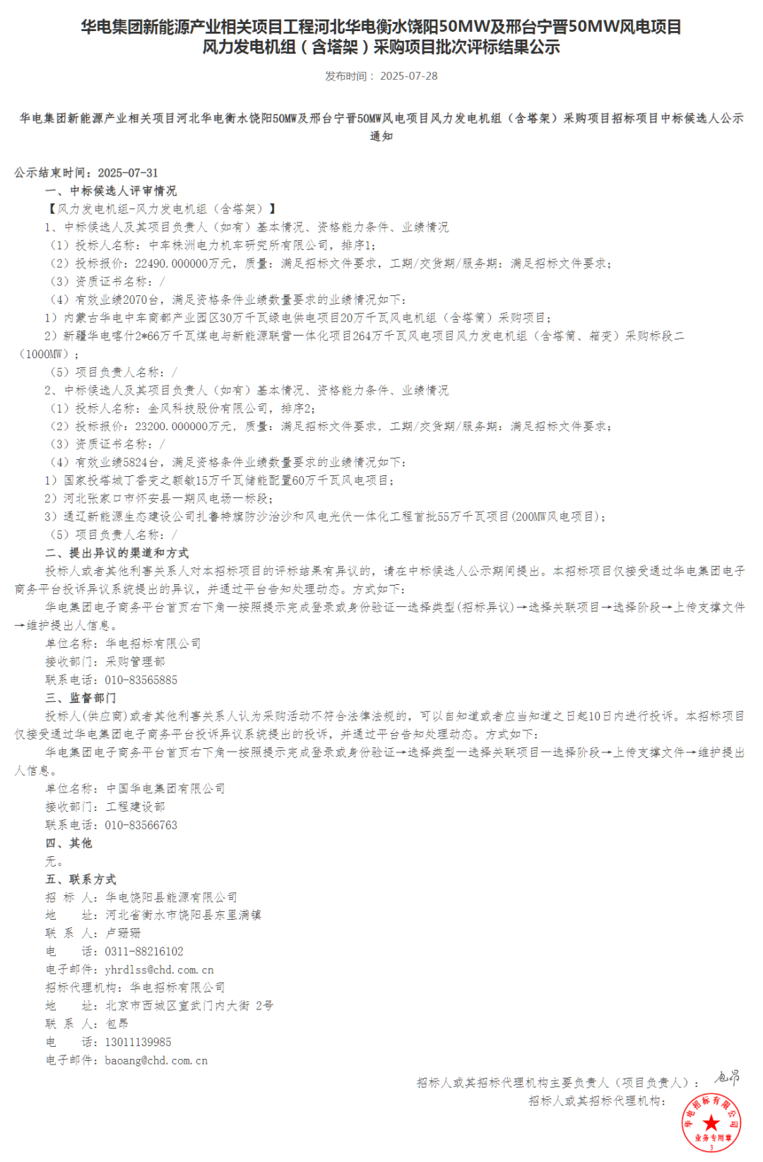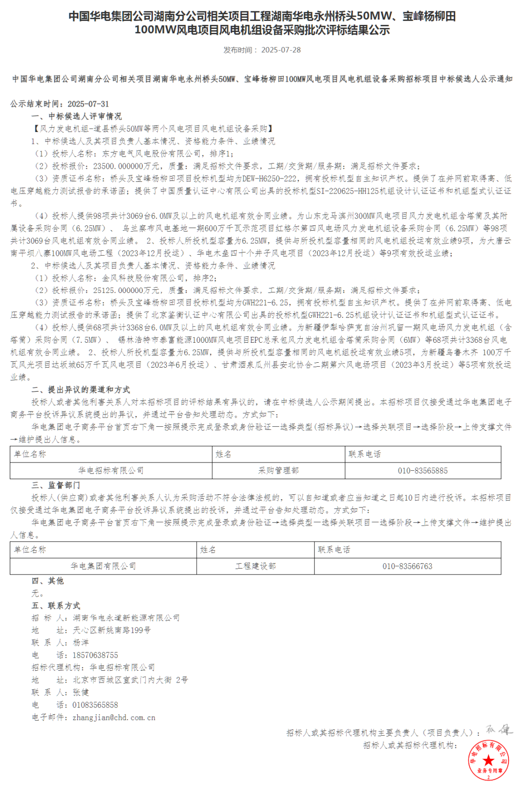 广东华电南雄大汉一期5万千瓦风电项目、二期3万千瓦风电项目位于广东省南雄市主田镇、江头镇、邓坊镇,韶关南雄市江头镇大汉风电场一期项目50MW、韶关南雄市江头镇大汉风电场(二期)项目30MW,一期项目风机规格数量为:8台6.25MW机型;二期项目风机规格数量为:4台6.25MW机型和1台5MW机型;招标采购项目工期:合同生效接买方通知后3个月内完成交货。风机暂定2025年9月30日开始供货,2026年3月1日前完成全部风机机位点交货。