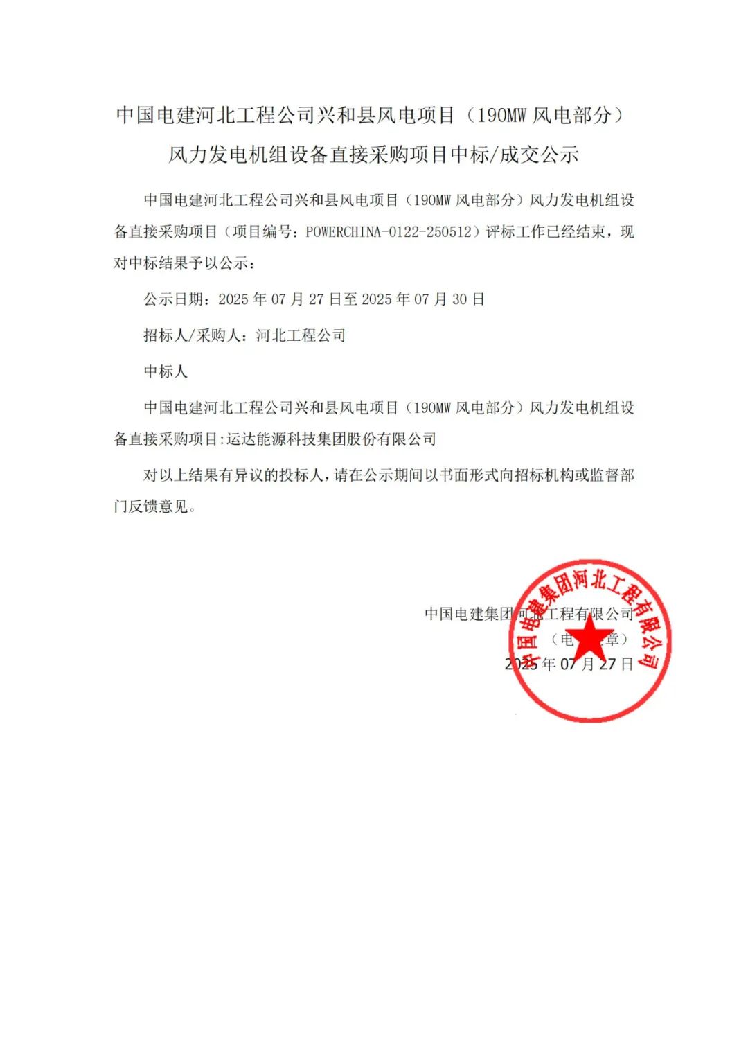 运达股份中标中国电建河北工程公司兴和县风电项目(190MW风电部分)。