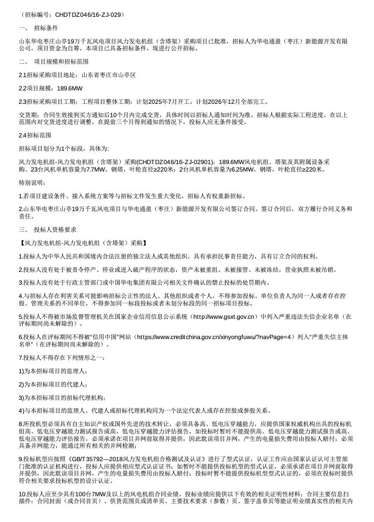 另一个项目是华电枣庄山亭19万千瓦风电项目,招标单位是,华电通盈(枣庄)新能源开发有限公司,项目地点:山东枣庄。